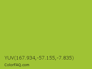 YUV 167.934,-57.155,-7.835 Color is a normal lime color and the nearest color is Android Green #a4c639. Hex code #9fc334 and RGB value is rgb(159,195,52). In RGB color space, this color is composed of 62% red, 76% green, 20% blue, In CMYK color space, this color is composed of 18% cyan, 0% magenta, 73% yellow , 24% black , In HSL color space, this color has a hue angle of 75° , 58% saturation and 48% lightness.
