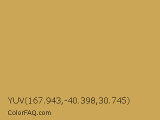 YUV 167.943,-40.398,30.745 Color is a normal orange color and the nearest color is Roti #c6a84b. Hex code #cba656 and RGB value is rgb(203,166,86). In RGB color space, this color is composed of 80% red, 65% green, 34% blue, In CMYK color space, this color is composed of 0% cyan, 18% magenta, 58% yellow , 20% black , In HSL color space, this color has a hue angle of 41° , 53% saturation and 57% lightness.