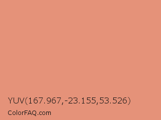 YUV 167.967,-23.155,53.526 Color is a light red color and the nearest color is Dark Salmon #e9967a. Hex code #e59279 and RGB value is rgb(229,146,121). In RGB color space, this color is composed of 90% red, 57% green, 47% blue, In CMYK color space, this color is composed of 0% cyan, 36% magenta, 47% yellow , 10% black , In HSL color space, this color has a hue angle of 14° , 68% saturation and 69% lightness.