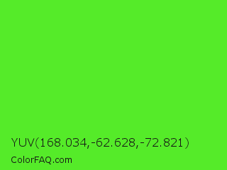 YUV 168.034,-62.628,-72.821 Color is a normal green color and the nearest color is Harlequin Green #46cb18. Hex code #55eb29 and RGB value is rgb(85,235,41). In RGB color space, this color is composed of 33% red, 92% green, 16% blue, In CMYK color space, this color is composed of 64% cyan, 0% magenta, 83% yellow , 8% black , In HSL color space, this color has a hue angle of 106° , 83% saturation and 54% lightness.