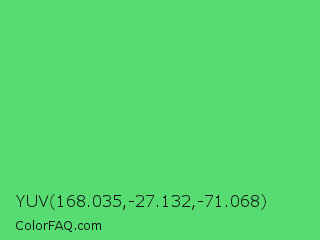 YUV 168.035,-27.132,-71.068 Color is a normal green color and the nearest color is Emerald #50c878. Hex code #57dc71 and RGB value is rgb(87,220,113). In RGB color space, this color is composed of 34% red, 86% green, 44% blue, In CMYK color space, this color is composed of 60% cyan, 0% magenta, 49% yellow , 14% black , In HSL color space, this color has a hue angle of 132° , 66% saturation and 60% lightness.