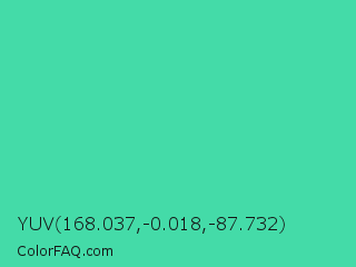 YUV 168.037,-0.018,-87.732 Color is a normal green color and the nearest color is Eucalyptus #44d7a8. Hex code #44dba8 and RGB value is rgb(68,219,168). In RGB color space, this color is composed of 27% red, 86% green, 66% blue, In CMYK color space, this color is composed of 69% cyan, 0% magenta, 23% yellow , 14% black , In HSL color space, this color has a hue angle of 160° , 68% saturation and 56% lightness.