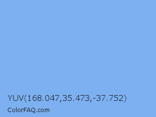 YUV 168.047,35.473,-37.752 Color is a light blue color and the nearest color is Aero #7cb9e8. Hex code #7db0f0 and RGB value is rgb(125,176,240). In RGB color space, this color is composed of 49% red, 69% green, 94% blue, In CMYK color space, this color is composed of 48% cyan, 27% magenta, 0% yellow , 6% black , In HSL color space, this color has a hue angle of 213° , 79% saturation and 72% lightness.