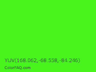 YUV 168.062,-68.558,-84.246 Color is a normal green color and the nearest color is Neon Green #39ff14. Hex code #48f41d and RGB value is rgb(72,244,29). In RGB color space, this color is composed of 28% red, 96% green, 11% blue, In CMYK color space, this color is composed of 70% cyan, 0% magenta, 88% yellow , 4% black , In HSL color space, this color has a hue angle of 108° , 91% saturation and 54% lightness.