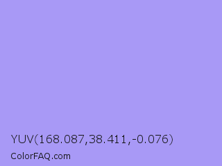 YUV 168.087,38.411,-0.076 Color is a light indigo color and the nearest color is Dull Lavender #a899e6. Hex code #a899f6 and RGB value is rgb(168,153,246). In RGB color space, this color is composed of 66% red, 60% green, 96% blue, In CMYK color space, this color is composed of 32% cyan, 38% magenta, 0% yellow , 4% black , In HSL color space, this color has a hue angle of 250° , 84% saturation and 78% lightness.