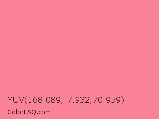 YUV 168.089,-7.932,70.959 Color is a light red color and the nearest color is Tulip #ff878d. Hex code #f98298 and RGB value is rgb(249,130,152). In RGB color space, this color is composed of 98% red, 51% green, 60% blue, In CMYK color space, this color is composed of 0% cyan, 48% magenta, 39% yellow , 2% black , In HSL color space, this color has a hue angle of 349° , 91% saturation and 74% lightness.