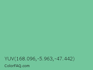 YUV 168.096,-5.963,-47.442 Color is a light green color and the nearest color is De York #7ac488. Hex code #72c69c and RGB value is rgb(114,198,156). In RGB color space, this color is composed of 45% red, 78% green, 61% blue, In CMYK color space, this color is composed of 42% cyan, 0% magenta, 21% yellow , 22% black , In HSL color space, this color has a hue angle of 150° , 42% saturation and 61% lightness.