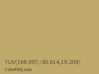 YUV 168.097,-30.614,19.209 Color is a normal orange color and the nearest color is Gimblet #b8b56a. Hex code #bea96a and RGB value is rgb(190,169,106). In RGB color space, this color is composed of 75% red, 66% green, 42% blue, In CMYK color space, this color is composed of 0% cyan, 11% magenta, 44% yellow , 25% black , In HSL color space, this color has a hue angle of 45° , 39% saturation and 58% lightness.