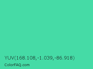 YUV 168.108,-1.039,-86.918 Color is a normal green color and the nearest color is Eucalyptus #44d7a8. Hex code #45dba6 and RGB value is rgb(69,219,166). In RGB color space, this color is composed of 27% red, 86% green, 65% blue, In CMYK color space, this color is composed of 68% cyan, 0% magenta, 24% yellow , 14% black , In HSL color space, this color has a hue angle of 159° , 68% saturation and 56% lightness.