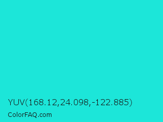 YUV 168.12,24.098,-122.885 Color is a normal cyan color and the nearest color is Bright Turquoise #08e8de. Hex code #1ce6d9 and RGB value is rgb(28,230,217). In RGB color space, this color is composed of 11% red, 90% green, 85% blue, In CMYK color space, this color is composed of 88% cyan, 0% magenta, 6% yellow , 10% black , In HSL color space, this color has a hue angle of 176° , 80% saturation and 51% lightness.