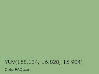 YUV 168.134,-16.828,-15.904 Color is a light green color and the nearest color is Dark Sea Green #8fbc8f. Hex code #96b886 and RGB value is rgb(150,184,134). In RGB color space, this color is composed of 59% red, 72% green, 53% blue, In CMYK color space, this color is composed of 18% cyan, 0% magenta, 27% yellow , 28% black , In HSL color space, this color has a hue angle of 101° , 26% saturation and 62% lightness.