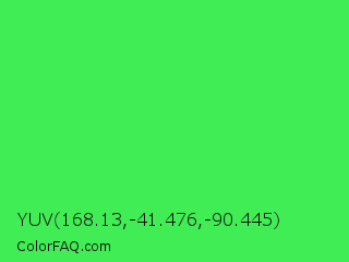 YUV 168.13,-41.476,-90.445 Color is a normal green color and the nearest color is UFO Green #3cd070. Hex code #41ed54 and RGB value is rgb(65,237,84). In RGB color space, this color is composed of 25% red, 93% green, 33% blue, In CMYK color space, this color is composed of 73% cyan, 0% magenta, 65% yellow , 7% black , In HSL color space, this color has a hue angle of 127° , 83% saturation and 59% lightness.