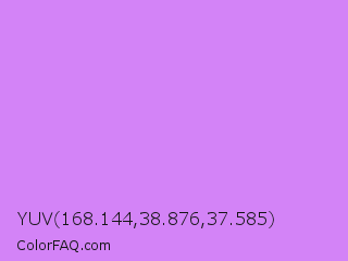 YUV 168.144,38.876,37.585 Color is a light purple color and the nearest color is Bright Lilac #d891ef. Hex code #d383f7 and RGB value is rgb(211,131,247). In RGB color space, this color is composed of 83% red, 51% green, 97% blue, In CMYK color space, this color is composed of 15% cyan, 47% magenta, 0% yellow , 3% black , In HSL color space, this color has a hue angle of 281° , 88% saturation and 74% lightness.