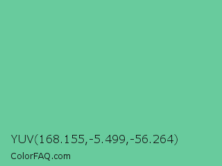 YUV 168.155,-5.499,-56.264 Color is a normal green color and the nearest color is Medium Aquamarine #66ddaa. Hex code #68cb9d and RGB value is rgb(104,203,157). In RGB color space, this color is composed of 41% red, 80% green, 62% blue, In CMYK color space, this color is composed of 49% cyan, 0% magenta, 23% yellow , 20% black , In HSL color space, this color has a hue angle of 152° , 49% saturation and 60% lightness.
