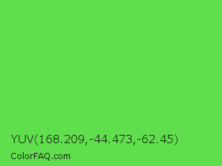 YUV 168.209,-44.473,-62.45 Color is a normal green color and the nearest color is Mantis #74c365. Hex code #61de4e and RGB value is rgb(97,222,78). In RGB color space, this color is composed of 38% red, 87% green, 31% blue, In CMYK color space, this color is composed of 56% cyan, 0% magenta, 65% yellow , 13% black , In HSL color space, this color has a hue angle of 112° , 69% saturation and 59% lightness.