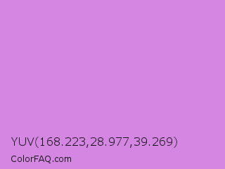 YUV 168.223,28.977,39.269 Color is a light purple color and the nearest color is Bright Lilac #d891ef. Hex code #d586e3 and RGB value is rgb(213,134,227). In RGB color space, this color is composed of 84% red, 53% green, 89% blue, In CMYK color space, this color is composed of 6% cyan, 41% magenta, 0% yellow , 11% black , In HSL color space, this color has a hue angle of 291° , 62% saturation and 71% lightness.