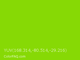 YUV 168.314,-80.514,-29.216 Color is a normal green color and the nearest color is Alien Armpit #84de02. Hex code #87d905 and RGB value is rgb(135,217,5). In RGB color space, this color is composed of 53% red, 85% green, 2% blue, In CMYK color space, this color is composed of 38% cyan, 0% magenta, 98% yellow , 15% black , In HSL color space, this color has a hue angle of 83° , 95% saturation and 44% lightness.