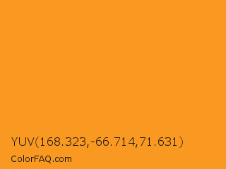 YUV 168.323,-66.714,71.631 Color is a normal orange color and the nearest color is Tree Poppy #fc9c1d. Hex code #fa9921 and RGB value is rgb(250,153,33). In RGB color space, this color is composed of 98% red, 60% green, 13% blue, In CMYK color space, this color is composed of 0% cyan, 39% magenta, 87% yellow , 2% black , In HSL color space, this color has a hue angle of 33° , 96% saturation and 55% lightness.