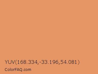 YUV 168.334,-33.196,54.081 Color is a light orange color and the nearest color is Di Serria #db995e. Hex code #e69665 and RGB value is rgb(230,150,101). In RGB color space, this color is composed of 90% red, 59% green, 40% blue, In CMYK color space, this color is composed of 0% cyan, 35% magenta, 56% yellow , 10% black , In HSL color space, this color has a hue angle of 23° , 72% saturation and 65% lightness.