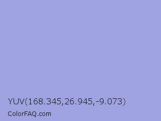 YUV 168.345,26.945,-9.073 Color is a light blue color and the nearest color is Wistful #a4a6d3. Hex code #9ea3df and RGB value is rgb(158,163,223). In RGB color space, this color is composed of 62% red, 64% green, 87% blue, In CMYK color space, this color is composed of 29% cyan, 27% magenta, 0% yellow , 13% black , In HSL color space, this color has a hue angle of 235° , 50% saturation and 75% lightness.