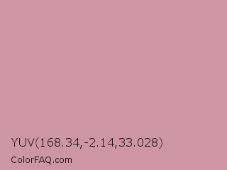 YUV 168.34,-2.14,33.028 Color is a light red color and the nearest color is Can Can #d591a4. Hex code #ce96a4 and RGB value is rgb(206,150,164). In RGB color space, this color is composed of 81% red, 59% green, 64% blue, In CMYK color space, this color is composed of 0% cyan, 27% magenta, 20% yellow , 19% black , In HSL color space, this color has a hue angle of 345° , 36% saturation and 70% lightness.