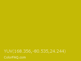 YUV 168.356,-80.535,24.244 Color is a normal yellow color and the nearest color is La Rioja #b3c110. Hex code #c4ba05 and RGB value is rgb(196,186,5). In RGB color space, this color is composed of 77% red, 73% green, 2% blue, In CMYK color space, this color is composed of 0% cyan, 5% magenta, 97% yellow , 23% black , In HSL color space, this color has a hue angle of 57° , 95% saturation and 39% lightness.