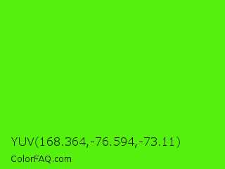 YUV 168.364,-76.594,-73.11 Color is a normal green color and the nearest color is Chlorophyll Green #4aff00. Hex code #55f10d and RGB value is rgb(85,241,13). In RGB color space, this color is composed of 33% red, 95% green, 5% blue, In CMYK color space, this color is composed of 65% cyan, 0% magenta, 95% yellow , 5% black , In HSL color space, this color has a hue angle of 101° , 90% saturation and 50% lightness.