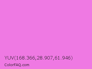 YUV 168.366,28.907,61.946 Color is a light magenta color and the nearest color is Lavender Magenta #ee82ee. Hex code #ef79e3 and RGB value is rgb(239,121,227). In RGB color space, this color is composed of 94% red, 47% green, 89% blue, In CMYK color space, this color is composed of 0% cyan, 49% magenta, 5% yellow , 6% black , In HSL color space, this color has a hue angle of 306° , 79% saturation and 71% lightness.