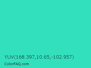 YUV 168.397,10.65,-102.957 Color is a normal cyan color and the nearest color is Turquoise PWG #30d5c8. Hex code #33e0be and RGB value is rgb(51,224,190). In RGB color space, this color is composed of 20% red, 88% green, 75% blue, In CMYK color space, this color is composed of 77% cyan, 0% magenta, 15% yellow , 12% black , In HSL color space, this color has a hue angle of 168° , 74% saturation and 54% lightness.