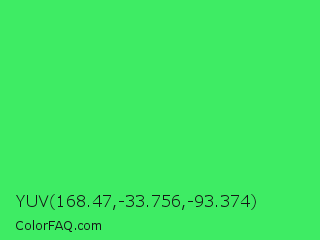 YUV 168.47,-33.756,-93.374 Color is a normal green color and the nearest color is UFO Green #3cd070. Hex code #3eec64 and RGB value is rgb(62,236,100). In RGB color space, this color is composed of 24% red, 93% green, 39% blue, In CMYK color space, this color is composed of 74% cyan, 0% magenta, 58% yellow , 7% black , In HSL color space, this color has a hue angle of 133° , 82% saturation and 58% lightness.