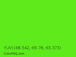 YUV 168.542,-69.78,-65.373 Color is a normal green color and the nearest color is Bright Green #66ff00. Hex code #5eea1b and RGB value is rgb(94,234,27). In RGB color space, this color is composed of 37% red, 92% green, 11% blue, In CMYK color space, this color is composed of 60% cyan, 0% magenta, 88% yellow , 8% black , In HSL color space, this color has a hue angle of 101° , 83% saturation and 51% lightness.