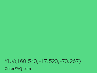 YUV 168.543,-17.523,-73.267 Color is a normal green color and the nearest color is Very Light Malachite Green #64e986. Hex code #55da85 and RGB value is rgb(85,218,133). In RGB color space, this color is composed of 33% red, 85% green, 52% blue, In CMYK color space, this color is composed of 61% cyan, 0% magenta, 39% yellow , 15% black , In HSL color space, this color has a hue angle of 142° , 64% saturation and 59% lightness.