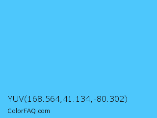 YUV 168.564,41.134,-80.302 Color is a light blue color and the nearest color is Picton Blue #45b1e8. Hex code #4dc7fc and RGB value is rgb(77,199,252). In RGB color space, this color is composed of 30% red, 78% green, 99% blue, In CMYK color space, this color is composed of 69% cyan, 21% magenta, 0% yellow , 1% black , In HSL color space, this color has a hue angle of 198° , 97% saturation and 65% lightness.