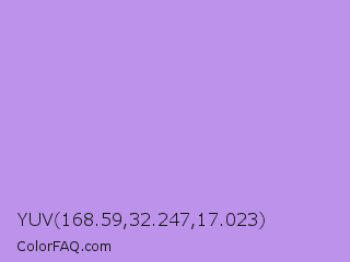 YUV 168.59,32.247,17.023 Color is a light violet color and the nearest color is Bright Lavender #bf94e4. Hex code #bc92ea and RGB value is rgb(188,146,234). In RGB color space, this color is composed of 74% red, 57% green, 92% blue, In CMYK color space, this color is composed of 20% cyan, 38% magenta, 0% yellow , 8% black , In HSL color space, this color has a hue angle of 269° , 68% saturation and 75% lightness.