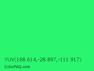 YUV 168.614,-28.897,-111.917 Color is a normal green color and the nearest color is UFO Green #3cd070. Hex code #29f56e and RGB value is rgb(41,245,110). In RGB color space, this color is composed of 16% red, 96% green, 43% blue, In CMYK color space, this color is composed of 83% cyan, 0% magenta, 55% yellow , 4% black , In HSL color space, this color has a hue angle of 140° , 91% saturation and 56% lightness.