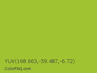 YUV 168.663,-59.487,-6.72 Color is a normal lime color and the nearest color is Android Green #a4c639. Hex code #a1c430 and RGB value is rgb(161,196,48). In RGB color space, this color is composed of 63% red, 77% green, 19% blue, In CMYK color space, this color is composed of 18% cyan, 0% magenta, 76% yellow , 23% black , In HSL color space, this color has a hue angle of 74° , 61% saturation and 48% lightness.