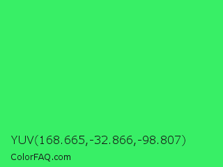 YUV 168.665,-32.866,-98.807 Color is a normal green color and the nearest color is UFO Green #3cd070. Hex code #38ef66 and RGB value is rgb(56,239,102). In RGB color space, this color is composed of 22% red, 94% green, 40% blue, In CMYK color space, this color is composed of 77% cyan, 0% magenta, 57% yellow , 6% black , In HSL color space, this color has a hue angle of 135° , 85% saturation and 58% lightness.