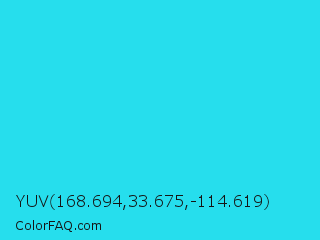 YUV 168.694,33.675,-114.619 Color is a normal cyan color and the nearest color is Loeen #15f2fd. Hex code #26deed and RGB value is rgb(38,222,237). In RGB color space, this color is composed of 15% red, 87% green, 93% blue, In CMYK color space, this color is composed of 84% cyan, 6% magenta, 0% yellow , 7% black , In HSL color space, this color has a hue angle of 185° , 85% saturation and 54% lightness.