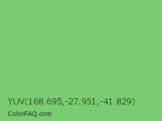 YUV 168.695,-27.951,-41.829 Color is a light green color and the nearest color is Mantis #74c365. Hex code #79cc70 and RGB value is rgb(121,204,112). In RGB color space, this color is composed of 47% red, 80% green, 44% blue, In CMYK color space, this color is composed of 41% cyan, 0% magenta, 45% yellow , 20% black , In HSL color space, this color has a hue angle of 114° , 47% saturation and 62% lightness.