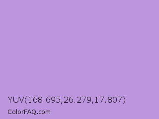 YUV 168.695,26.279,17.807 Color is a light purple color and the nearest color is Bright Lavender #bf94e4. Hex code #bd94de and RGB value is rgb(189,148,222). In RGB color space, this color is composed of 74% red, 58% green, 87% blue, In CMYK color space, this color is composed of 15% cyan, 33% magenta, 0% yellow , 13% black , In HSL color space, this color has a hue angle of 273° , 53% saturation and 73% lightness.