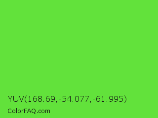 YUV 168.69,-54.077,-61.995 Color is a normal green color and the nearest color is Kiwi #8ee53f. Hex code #62e23b and RGB value is rgb(98,226,59). In RGB color space, this color is composed of 38% red, 89% green, 23% blue, In CMYK color space, this color is composed of 57% cyan, 0% magenta, 74% yellow , 11% black , In HSL color space, this color has a hue angle of 106° , 74% saturation and 56% lightness.