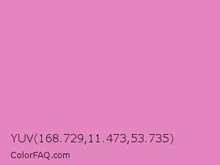 YUV 168.729,11.473,53.735 Color is a light magenta color and the nearest color is Shocking #e292c0. Hex code #e685c0 and RGB value is rgb(230,133,192). In RGB color space, this color is composed of 90% red, 52% green, 75% blue, In CMYK color space, this color is composed of 0% cyan, 42% magenta, 17% yellow , 10% black , In HSL color space, this color has a hue angle of 324° , 66% saturation and 71% lightness.