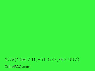 YUV 168.741,-51.637,-97.997 Color is a normal green color and the nearest color is Lime Green #32cd32. Hex code #39f640 and RGB value is rgb(57,246,64). In RGB color space, this color is composed of 22% red, 96% green, 25% blue, In CMYK color space, this color is composed of 77% cyan, 0% magenta, 74% yellow , 4% black , In HSL color space, this color has a hue angle of 122° , 91% saturation and 59% lightness.