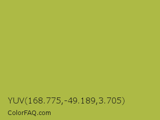 YUV 168.775,-49.189,3.705 Color is a normal yellow color and the nearest color is Android Green #a4c639. Hex code #adba45 and RGB value is rgb(173,186,69). In RGB color space, this color is composed of 68% red, 73% green, 27% blue, In CMYK color space, this color is composed of 7% cyan, 0% magenta, 63% yellow , 27% black , In HSL color space, this color has a hue angle of 67° , 46% saturation and 50% lightness.