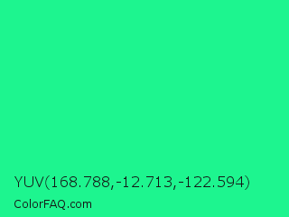 YUV 168.788,-12.713,-122.594 Color is a normal green color and the nearest color is Medium Spring Green #00fa9a. Hex code #1df58f and RGB value is rgb(29,245,143). In RGB color space, this color is composed of 11% red, 96% green, 56% blue, In CMYK color space, this color is composed of 88% cyan, 0% magenta, 42% yellow , 4% black , In HSL color space, this color has a hue angle of 152° , 92% saturation and 54% lightness.