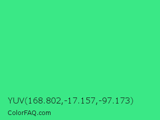 YUV 168.802,-17.157,-97.173 Color is a normal green color and the nearest color is UFO Green #3cd070. Hex code #3ae886 and RGB value is rgb(58,232,134). In RGB color space, this color is composed of 23% red, 91% green, 53% blue, In CMYK color space, this color is composed of 75% cyan, 0% magenta, 42% yellow , 9% black , In HSL color space, this color has a hue angle of 146° , 79% saturation and 57% lightness.