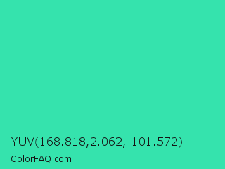 YUV 168.818,2.062,-101.572 Color is a normal green color and the nearest color is Eucalyptus #44d7a8. Hex code #35e3ad and RGB value is rgb(53,227,173). In RGB color space, this color is composed of 21% red, 89% green, 68% blue, In CMYK color space, this color is composed of 77% cyan, 0% magenta, 24% yellow , 11% black , In HSL color space, this color has a hue angle of 161° , 76% saturation and 55% lightness.