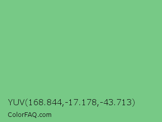 YUV 168.844,-17.178,-43.713 Color is a light green color and the nearest color is De York #7ac488. Hex code #77c986 and RGB value is rgb(119,201,134). In RGB color space, this color is composed of 47% red, 79% green, 53% blue, In CMYK color space, this color is composed of 41% cyan, 0% magenta, 33% yellow , 21% black , In HSL color space, this color has a hue angle of 131° , 43% saturation and 63% lightness.