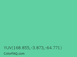 YUV 168.855,-3.873,-64.771 Color is a normal green color and the nearest color is Medium Aquamarine #66ddaa. Hex code #5fd0a1 and RGB value is rgb(95,208,161). In RGB color space, this color is composed of 37% red, 82% green, 63% blue, In CMYK color space, this color is composed of 54% cyan, 0% magenta, 23% yellow , 18% black , In HSL color space, this color has a hue angle of 155° , 55% saturation and 59% lightness.