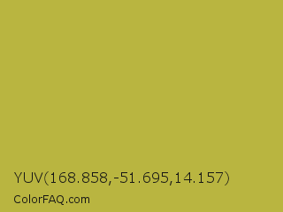 YUV 168.858,-51.695,14.157 Color is a normal yellow color and the nearest color is Brass #b5a642. Hex code #b9b540 and RGB value is rgb(185,181,64). In RGB color space, this color is composed of 73% red, 71% green, 25% blue, In CMYK color space, this color is composed of 0% cyan, 2% magenta, 65% yellow , 27% black , In HSL color space, this color has a hue angle of 58° , 49% saturation and 49% lightness.